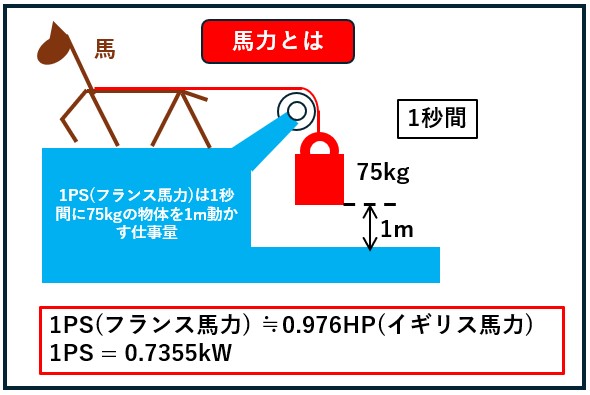 馬力は力ではなく仕事率、つまり単位時間あたりの仕事量(W)を表す大きさです。