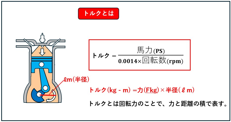 トルクですが、こちらは力の大きさを表す数値です。馬力は仕事率の高さで、例えば力が一定でも、エンジンの回転数を上げていけばいくほど馬力も高くなっていきます。