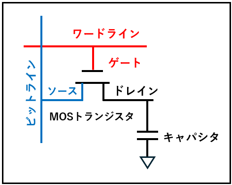 DRAMの回路構成を下記に記します。ワードラインの電源がONして、ゲートに電圧がかかり、ビットラインから電荷が供給されて、キャパシタに電荷が保持されて記憶を保持します。