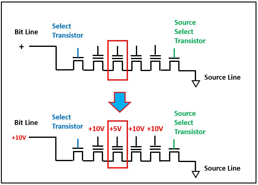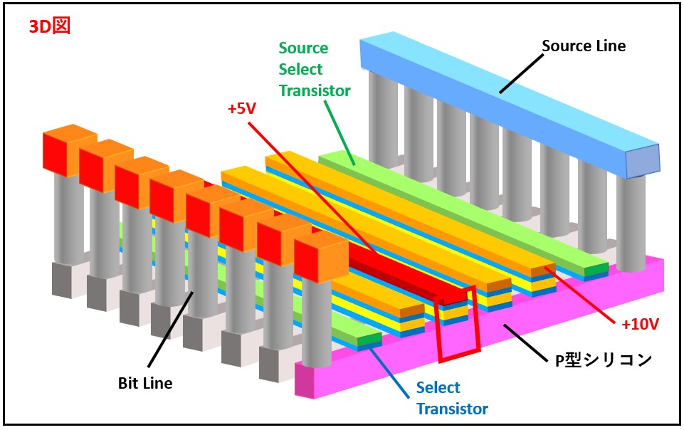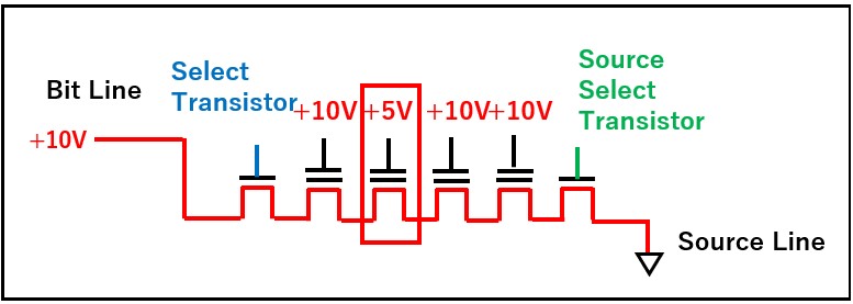 そして、判断対象となるセルが繋がっているBit Lineだけに+10V掛けます。他の判断対象にならないBit Lineは0V状態にします。