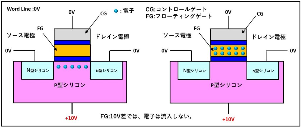 そして、下図が奥側の2本目以降で、ワード線に何も印加されていない、P型シリコン上のMOSセルにはやはり10Vしかかかっていない状態なので電子の移動はありません。