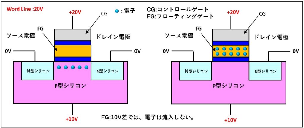 まず、記憶を保持する(書き込み動作)ですが、コントロール・ゲートに+20V程度をかけ、あとは、他の端子を0Vにすると、電子がトンネル酸化膜を貫通して、FGに流れ込みます。