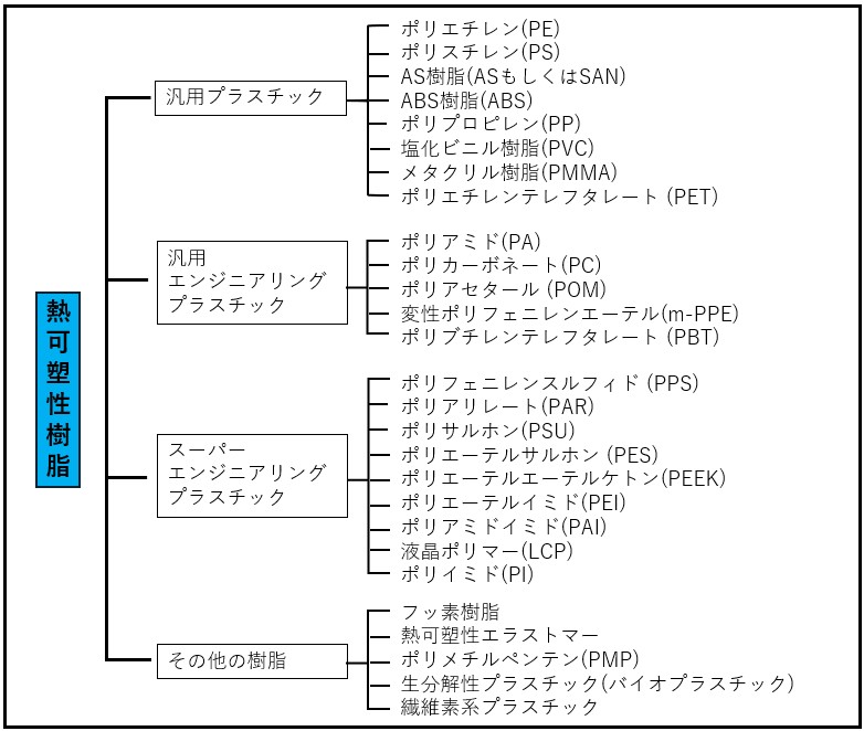 一方、熱可塑性樹脂は、熱をかけると軟化し流動し始めるので、金型で形をつくってから冷却します。 これを再び加熱するとまた軟化・流動します。このように加熱・冷却に対して可逆性があります。 ②汎用プラスチックとエンジニアリングプラスチック