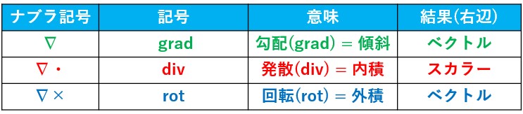ベクトル解析には、∇(ナブラ)という特殊な記号が現れます。それと「・」(内積)や「×」(外積)記号と組み合わせることにより意味を持ちます。それらについて一覧表にしてみました。